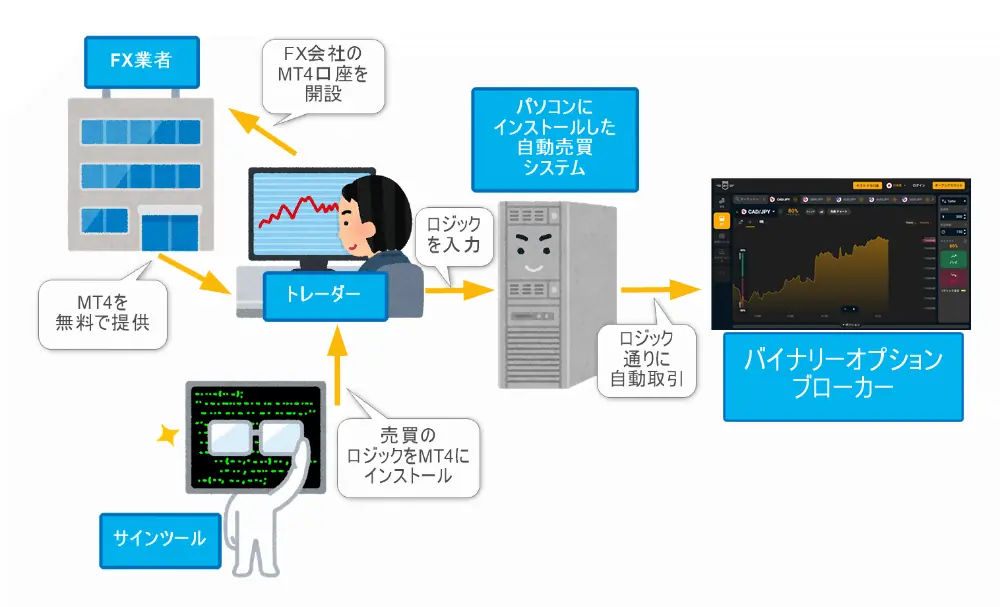 自動売買を行うにはまず、FXの取引プラットフォームであるMT4を用意し、次にトレードロジックが組み込まれたインジケーターを導入します。さらに、MT4上に表示されたサインを読み取り、指定したバイナリーオプションブローカーへエントリー指示を出すための外部自動売買システムを利用します。