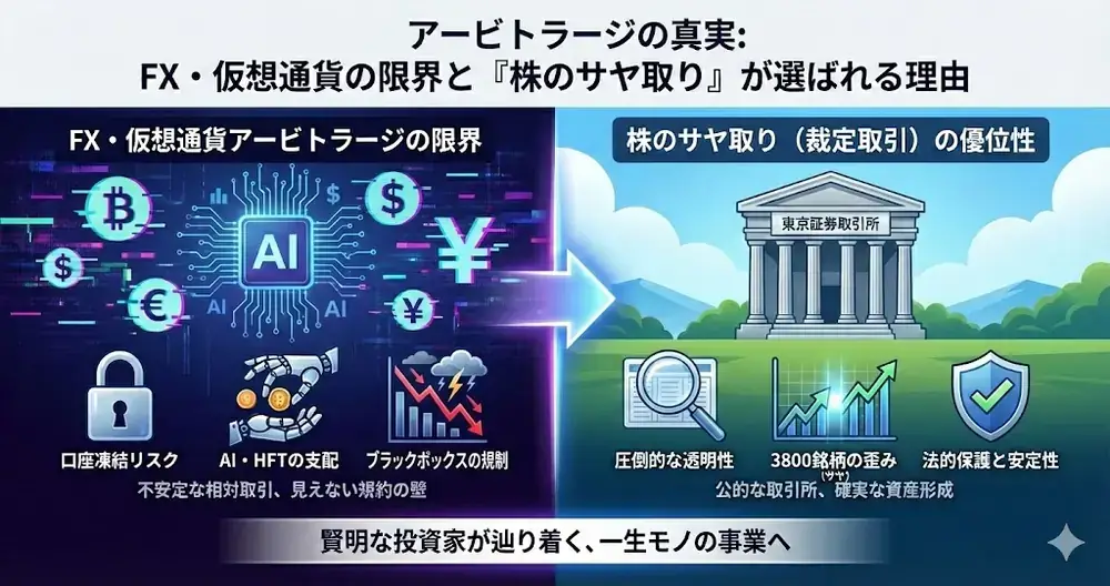 テクノロジーの極限までの進化により、単純な価格差はAIや超高速アルゴリズム(HFT)によって瞬時に埋め尽くされてしまいます。